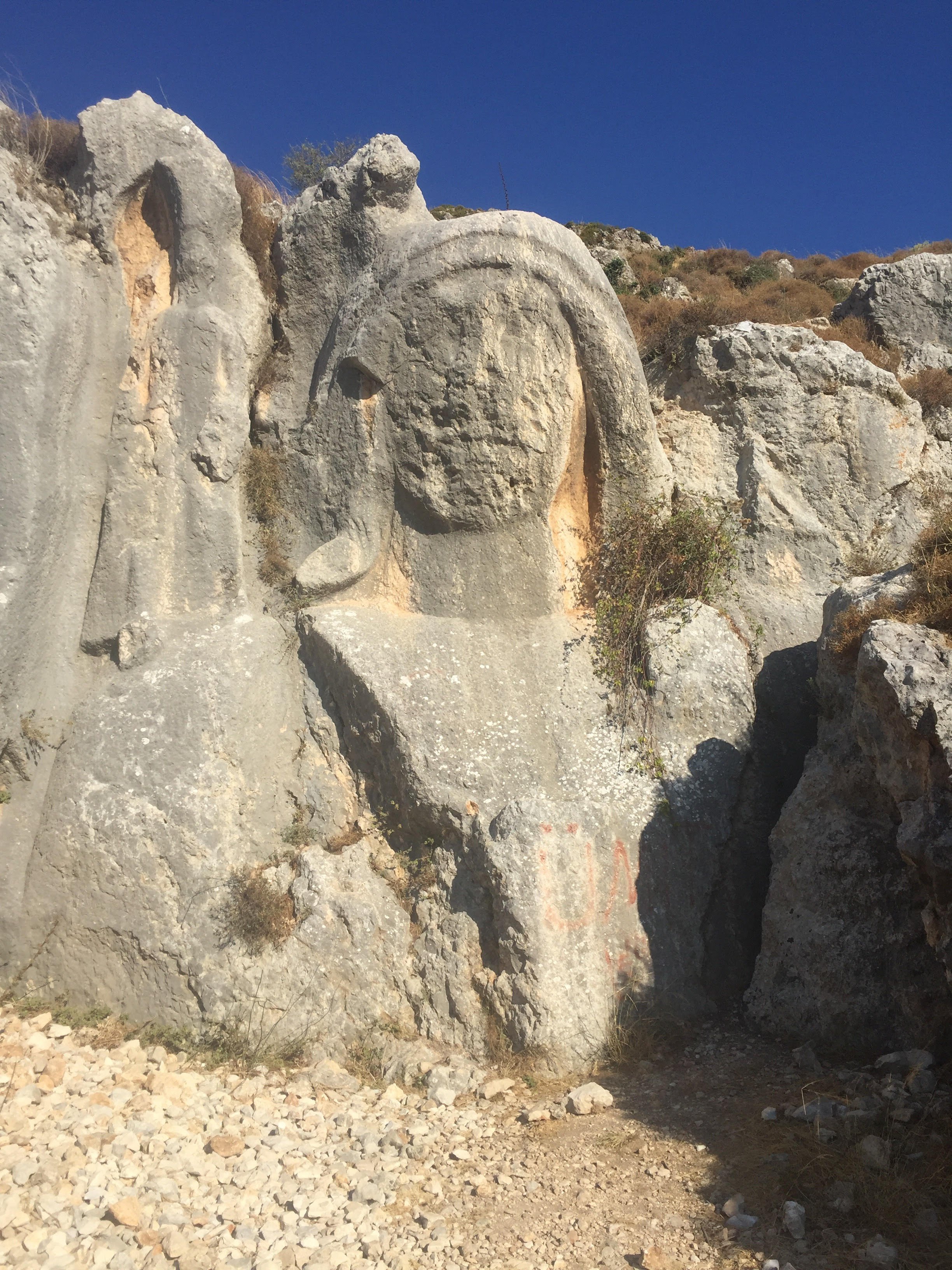 To the left of the church, we climbed up the rock at an elevation of some hundred meters, surrounded by shrubs and litter, to arrive at the monumental rock carving known as the Charonion. This isn’t anything like the ancient temples you would like to imagine as a visitor, such as the Temple of Artemis or the Asclepion, separated from the world by an archipelago of time. Instead, the monument is scribbled in red paint and left in a state of abeyance.