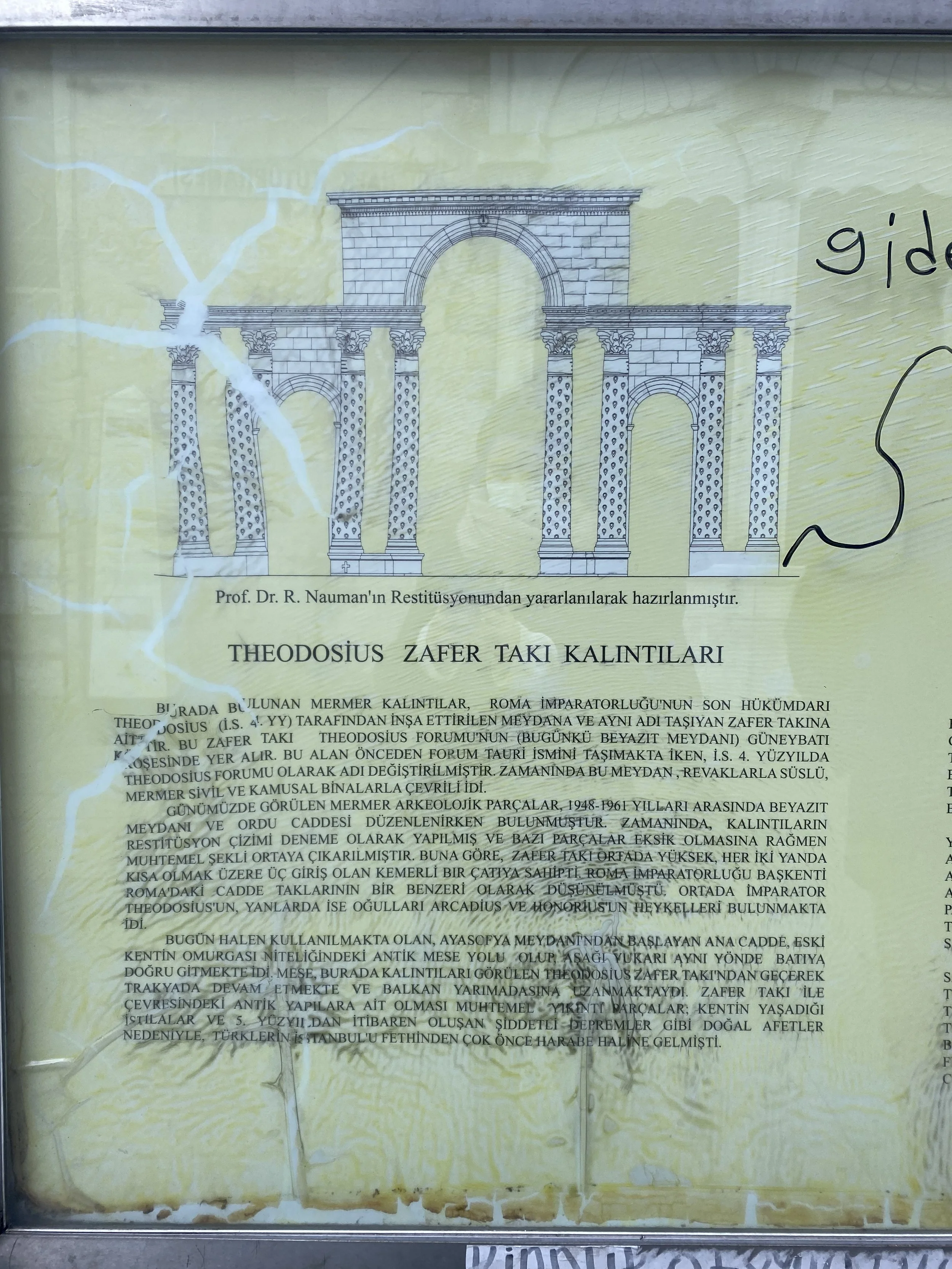 ‘’The Forum of Theodosius (Greek: φόρος Θεοδοσίου, today Beyazıt Square) was an area in Constantinople that was originally built by Constantine I and named the Forum Tauri. In 393, however, it was renamed after Emperor Theodosius I, who rebuilt it after the model of Trajan's Forum in Rome, with a triumphal arch of Proconnesian marble erected on the west side of the Forum. The triumphal arch had column piers carved in the form of Herculean clubs grasped by a fist. The arch and the ancient buildings around it were destroyed as a result of invasions, earthquakes, and other disasters’’